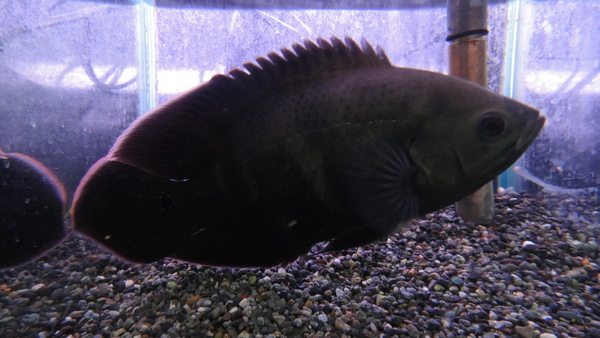 こっちは最近ちょくちょく入荷のあるブリードのバイヤ産オルビクラトゥスの飼い込み個体です!小さいうちから赤の発色が良く、早い段階でキレイに赤くなることが多い系統ですが、この個体を飼い込んでくれたお客様はあえて赤くならない渋いモノトーンのオスカーが欲しいということで数ある在庫の中からこの個体を選別されましたが、見事な選別眼!!この個体すごく地味で全然赤くありません!赤い点の出た鱗が数枚あるだけで真っ黒です!ただし、現状は真っ黒ですが気分によって体色の明暗は変化すると思います。それにしても、とてもおもしろい変わった個体ですので、こっちもマニアの方は必見ですよ!右下の画像です。