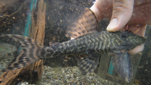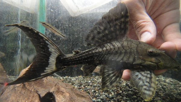ファンフィープレコのインボイスで入荷しましたが、聞いたことのない名前です。パッと見は茶色っぽい地味なペコルティア系のプレコの大型個体かな?という感じです。色は地味ですが、尾ビレのフィラメントが伸びてシルエットはかっこいいです!中段右の画像です。