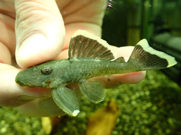黒っぽいオリーブグリーンにオレンジのヒレ先が特徴のプレコ。一見地味っぽい感じもしますが体色の濃淡が環境や気分によって変化するので鮮やかなオリーブグリーンに発色した時なんかはかなりキレイですよ!ぜひ飼い込んでみてください!右上の画像です。
