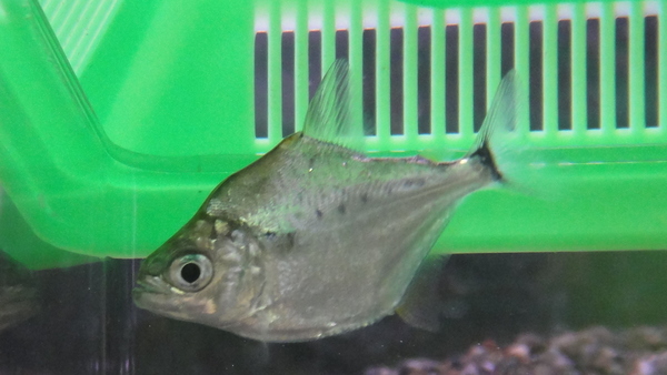 長目の体型で、小判型とでも言いましょうか、そんな感じのメチニスです。銀色の体に赤く色付いた臀ビレと尾ビレで、カラーリングは普通のメチニスに近いのですが、なんとも独特な体型です。1匹のみです。