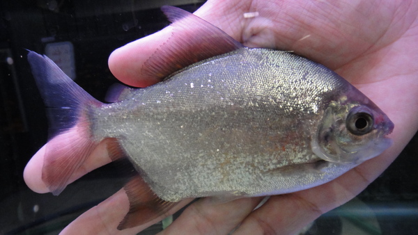 ビッグアイパクーのインボイスで入荷しましたが、この個体も少しだけ体側の朱色の班が出ています。それで、たぶん上記のレッドスポットパクーと同種で、オスとメスだと思います。レッドスポットは臀ビレの真ん中辺りが広がったような形になっていて、ビッグアイは臀ビレが長めで、真ん中辺りがえぐれたような形になっています。