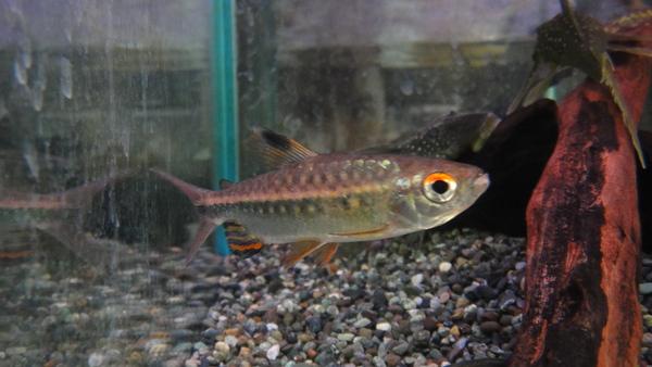レッドアイカラシンなんて仕入れたのはどれくらいぶりだろう??久しぶりに見たからなのか、ものすごく新鮮な感じでこの魚のキレイさをあらためて実感しました。ですが、なんかイメージしてたレッドアイカラシンと少し違うような気がします。なんか全体的に色が濃くて、臀ビレにオレンジの縞模様があります。レッドアイカラシンってこんな魚でしたっけ??すいませんこういうキレイ系の魚にはあまり強くなくて・・・。