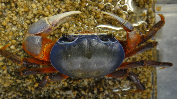 こちらもアフリカ産のオカガニの1種で、アフリカのオカガニではよく目にする種類で青い体と赤い足がものすごい派手できれいです。