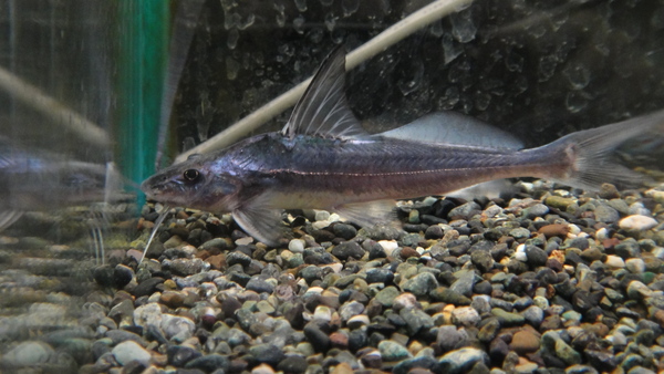 超激レア!超マニアックナマズ!当店初入荷です!!私も実物は初めて見ましたが、なんか南米産のピラーとアジア産のホラバグルスを足して2で割ったようなそんな感じの魚です。はっきりいって中途半端で、色も地味だし全然キレイじゃないです。でもまぁなんとなくかわいくもありかっこよくもあるかな??みたいなそんなナマズです。でも見ためがどうとか色がどうとかそんなことは別にどうでもいいんです(どうでもいいのか?)!!とにかく珍しく、この魚の存在が素晴らしいんです!ヘルメットキャット(Cranoglanis bouderius)は中国に分布する魚で、3種か4種しか記載されていないクラノグラニス属の1種で、とても原始的なナマズの仲間で詳しいことはまだまだほとんど解明されてないそうです。そのため入荷も少なく雑誌や図鑑にもほとんど載っていないのでこんな魚知らなかったという方がほとんどだと思います。もしこの魚のことを知っていたという方はそれだけで相当なマニアです!もしこの魚を知っていて飼いたい、欲しいなんていう方はもう(良い意味で)変態です!そしてこの魚飼ってるよ、なんていう方は(ほめ言葉です)ド変態です!性格は大人しいらしく、中国産というだけあり幅広い温度域に適応し丈夫らしいです。餌は小魚を食べるらしいのですが、口の形状や見た目の感じからは人工飼料にもすぐ餌付きそうです。すいません、私も初めてなので何となくしか分からなくて。大特価(この値段でも大特価です!本当はとっても高価なんです!!)1匹のみです!左上の画像です。