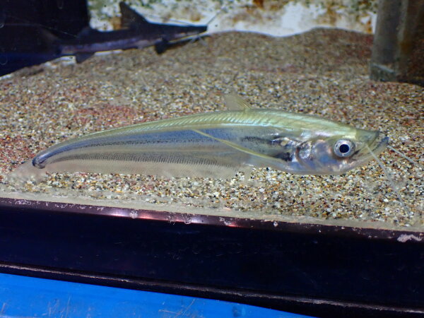 大きく裂けた口とそこに生える鋭く尖った牙が特徴のナマズ。ビカビカした銀色の体色もキレイでカッコいいです。最近は輸入量が激減で希少な魚になりました。今回小さい過ぎず大きすぎずなお手頃サイズのが来ました!ちなみに値段上がりますがもっと大きいのも1匹在庫いますのでお好きなサイズをどうぞ!左下の画像です。