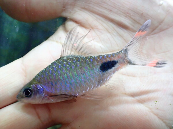 フィラメントーサスに近い種類と思われますが詳細は不明。尾ビレの模様はフィラメントーサスと同じ感じで、アッシミリスほどではありませんが目の回りにうっすら青黒い班が入ります。鱗の光沢もフィラメントーサスよりも明らかに青っぽい紫っぽい感じ。あとオスは尾筒に入る黒班がバチ状に少し下に広がるような形になっています。正体はよく分かりませんがとてもキレイで魅力的な魚です。入荷は少数です。気になる方はお早めに!左下がオスの画像で右下がメスの画像です。