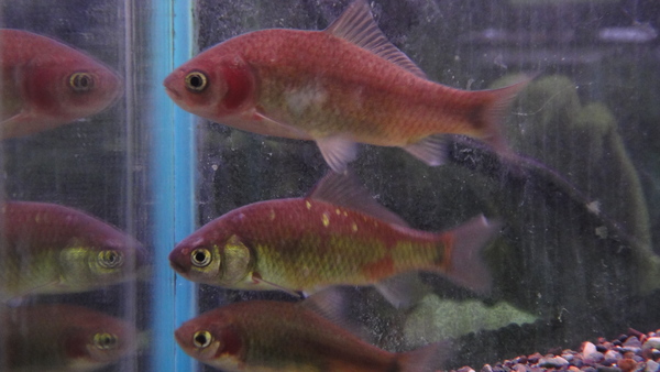 インドのバングラデイッシュ国境付近で採集された珍しいコイ科の魚で、夜行性の強い魚だそうで、昼間は洞窟に潜み、夜になると餌をとりに動き始めるらしいです。見た目はちょっとスリムにして、ヒレに色をつけたフナです。地味な魚ですがかなり珍しい魚ですし、珍しい性質もあり、マニア心をくすぐりますね!中段右の画像です。