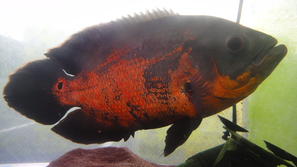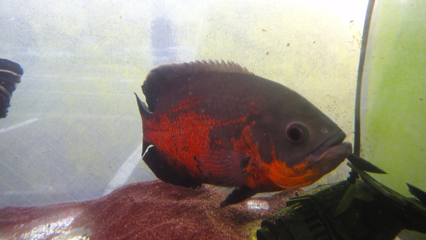 上段がオス親で、ネグロ産ルブロオセラータスということで来ていますが、たぶん違うかな・・・?体高は低く、顔も尖り気味で体型はそれっぽいのですが、模様、色が違う感じもします。それでも、元はもっとキレイに赤く発色していたのですが、メス親にボロボロにされてしまい、その後に再生した皮や鱗の色がとんでしまい赤い部分が少なくなってしまいました。ルブロオセラータスかどうかは分かりませんが、貴重なブラジリアンオスカーなのは間違いありませんのでいい魚だと思います。