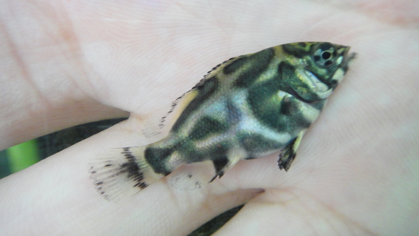 下段が稚魚です。現状で3cm~3,5cm位に育ちました。幼魚班が出ていますが、今まで見たオスカーとは違うおもしろい変わった模様だと思います。もう少し大きくなって、ヒレの歪みや奇形などの選別ができる大きさになったら販売する予定です。