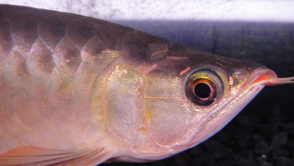 ちょっと変わったアロワナが欲しいという方にオススメ!見た目はグリーンアロワナっぽいのですが、顔つきが鋭く尖った感じでかっこいいです。体高もあるしスタイルはとってもいいです。色はグリーン特有の模様が鱗には入るのですが、エラ蓋や鱗には紅金のような光沢のある発色が見られ、4列目までがうっすらと光っています。