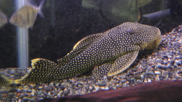 平べったくて細かいスポットがキレイな珍しいプレコです。成熟したオスは頬や胸ビレのトゲがものすごいことになります!!
