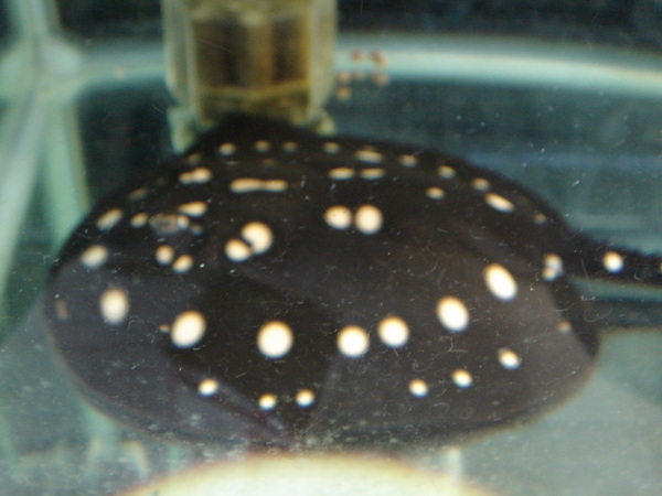 ♂が1枚だけ入荷しました。大きさは体盤直径で20cm以上あります。エサ食いすごく良いです。入荷してすぐにキャットをモリモリ食べています。極美個体!写真がきたなくてごめんなさい!