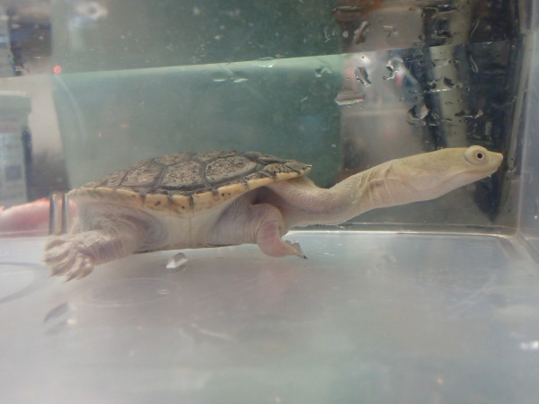 ホームページ載せる前に売れてしまましたがせっかく入荷したので載せておきます。甲羅は黒いですが皮膚は真っ白です。爪も一部クリアネイルになってます。ナガクビガメにありがちな甲ズレや多甲板もなくとてもキレイな個体です。ベビーよりそだった安心サイズで餌も人工飼料に餌付いてます。甲羅がちょっと細くてオブロンガみたいでカッコいいですよ!上段、中段の画像です。4つの画像は同一個体です。