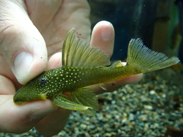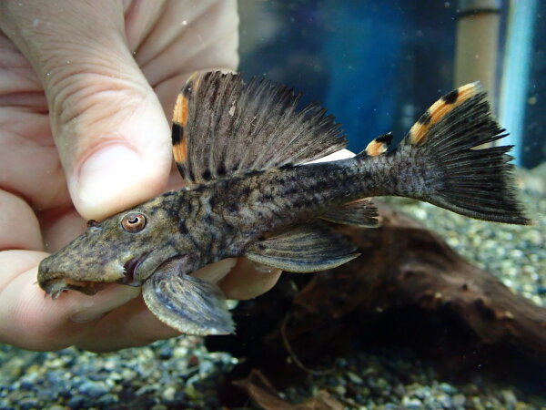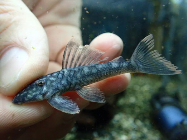 模様キレイだしシルエットもカッコいいし、このプレコ大好きです!昔は25cm位の特大サイズとかも輸入されたりしてたんですけどね、最近は大きいの全然来ません・・・。大きめ来たとしても12~13cm位のがいいところかな。なので今回来た16cmっていうのも最近ではなかなか見られないかなり大きいサイズです!水槽内でどこまで大きくできるかは分かりませんが、目指せ25cm!!左上の画像です。来たばかりなので少しヒレとかスレてますが、しばらく飼い込んであげれば尾ビレも背ビレももっと大きくなってカッコよくなります!