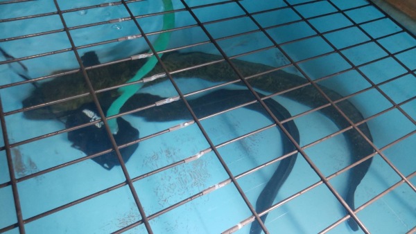 すごいの来ました!今までにも大きいオオウナギは何匹も扱ってきましたがこのサイズは初めてです!今まで入荷した中でもダントツの大きさです!こんなデカいの売ってるお店はきっと他にはないです!もうデカすぎてびっくりです!120cmでも相当デカいのにその120cmの個体が小さく見えますよ!発送もしますが発送の場合は死着保証無しでお願いします。でも鹿児島から普通に宅急便で届いたからまず大丈夫だと思いますけどね。上段、中段左の画像です。入っている水槽の対角の長さが145cmです。