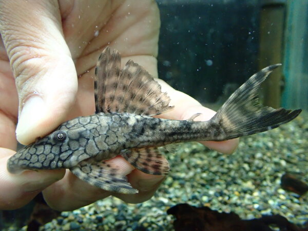 このプレコ好きです。地味めでそんなに人気無いですが渋くてカッコいいです。水槽内でもけっこう成長早いし、丈夫で飼い易いし、コケも食べるしで良いプレコです。もっと小さいベビーサイズでの入荷が多いんですが、今回はまぁまぁ大きめのナイズサイズです。ぜひ育ててみてください!中段左の画像です。