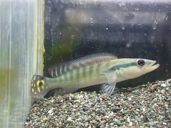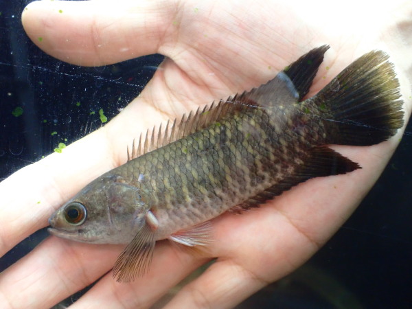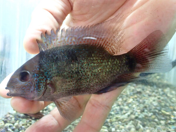 最大で15cmほどになり、この仲間の中では大型の種類。鱗にはメタリックグリーンの光沢が出てきてオスは背ビレが櫛状に伸びてきますので、大きく成長した個体は本当にキレイです。安価なブリード個体が輸入されることもありますがなぜかブリード個体は体高が低く細長い感じの体型になりがちで、発色もワイルドの方がキレイです。まだ小さくて本来の発色には程遠いですがぜひ立派な個体に育ててみてください!