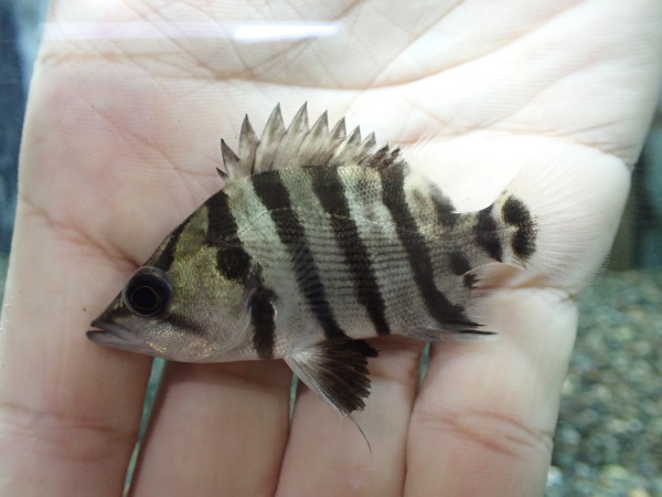 ダトニオの仲間の中でも一番人工飼料に餌付きやすい種類だと思います。人工飼料食べる魚と混泳させてるとそのうちつられて食べるようになることがほとんど。早く大きくしたいなら生き餌がいいと思いますが、とりあえず冷凍赤虫あげながら人工飼料に餌付けてみては??右上の画像です。