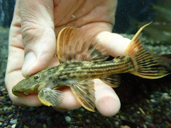 かなり久しぶりです!既に尾ビレのフィラメントは長く伸びていてホワイトテールな特徴がはっきり出ています。名前にアカリエスピーニョとありますが普通のアカリエスピーニョとは全然違いますしトリムプレコの仲間でもありません。大きくなっても尾ビレの白いフィラメントは長く伸びたままなのでごくシルエットのカッコいいプレコになりますよ。最近では滅多に輸入されなくなり見かけることもほとんどない希少なプレコになりました。マニアの方ぜひどうぞ!中段左の画像です。