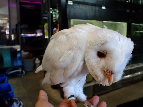 7月6日生まれのスーパーホワイトメンフクロウのヒナが入荷しました。画像だと分かりにくいですが目は濃いブドウ目です。スーパーホワイトでも多少の模様は出ますがその模様の出方には個体差があり同じ親から生まれた兄弟でもほぼ真っ白な個体からやや濃いめに模様が出る個体まで様々。今回入荷した個体は少しだけ模様出てますがほぼ真っ白でとてもキレイな個体です。メンフクロウはフクロウの中でも特に馴れやすくとても飼い易い種類で猛禽類の飼育が初めてと言う方にもオススメの種類です。メンフクロウは独特の顔つきから好みの分かれる種類ですが白いメンフクロウはすごく可愛いですよ。メンフクロウがあまり好みではないという方でも白いメンフクロウならきっとカワイイと思ってもらえると思います!今回入荷した個体はホームページに載せる前に売約になってしまいましたが、スタンドにつなげる位にしっかりするまで、もうしばらくはお店にいますのでぜひ見に来てください!画像は全て同一個体です。