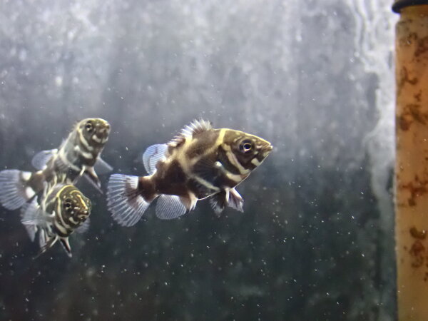 小さいから超お買い得!クレニキクラプロテウスのインボイスで入荷しましたがゼブラパイクの幼魚にそっくりです。ゼブラパイクよりも尖った顔をしているような気もしますが、緑がかった体色と背中のバンド、尾ビレにうっすらはいるまだら模様なんかはまんまゼブラパイク。もうちょっと大きくなればはっきりすると思いますが、学名で画像検索するとプロテウスという種類も結構キレイな種類みたいなんで、この値段なら育てる価値ありますね!