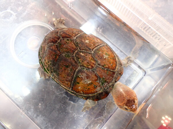 以前にホオアカドロガメとして輸入された個体ですが、ノドジロドロガメっぽい感じもします。サソリドロガメの亜種は同定が難しいので間違ってたらごめんなさい。とは言えホオアカにしてもノドジロにしても何故かオスがほとんどいないので繁殖を狙うにしてもペアを揃えるのが大変なんです。しかもサイテス入りしてしまったので今後の入荷は期待できません・・・。なので今回入荷したオスは超お宝個体ですよ!ホオアカにしてもノドジロにしてもメスだったらサイテス入りの前に輸入された個体がまだ国内で流通していますのでこのオスを手に入れておけばペアを揃えるのは難しくありませんし、既にメスを飼育していてオスを探しているという方も多いと思いますのでこの個体は本当にオススメです!ほんの少しに縁甲板に欠けがありますがワイルドなのでまぁこれ位はね。それ以外に欠点はなく爪欠けも甲ズレもありません。超貴重なオスがこの値段はかなりお買い得ですし、今後もオス個体の入荷は無いかもしれませんので、このチャンスをお見逃しなく!画像は全て同一個体です。