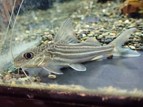 広域に分布する種類ですがブラジル産は結構珍しいです。今回はトカンチンス産の個体ですが、縦じまとカラクサ模様が混ざったような模様で結構カッコいいです。模様は成長につれてまだまだ変化していくと思いますのでその辺を観察しながら飼育するのも面白いですよ!ピメロディアの仲間ってカッコいいし丈夫だしすごく良い魚ですよ!中段右の画像で。。