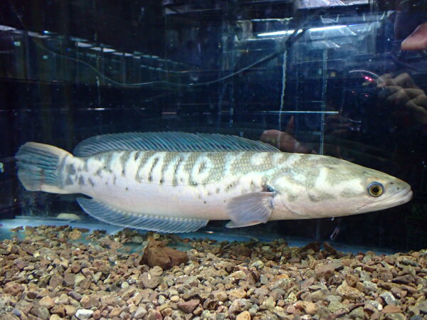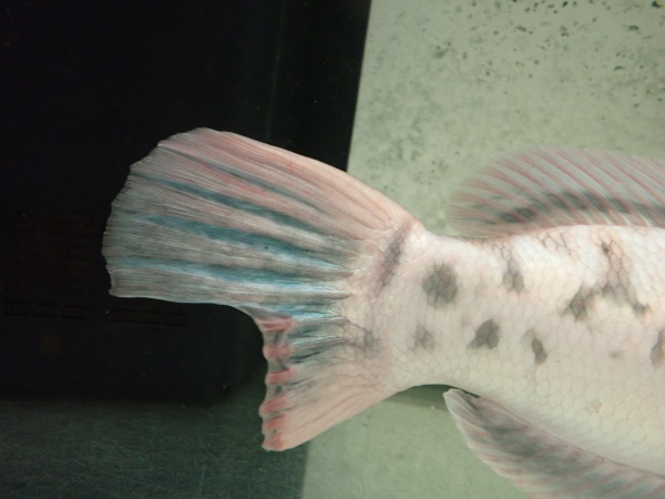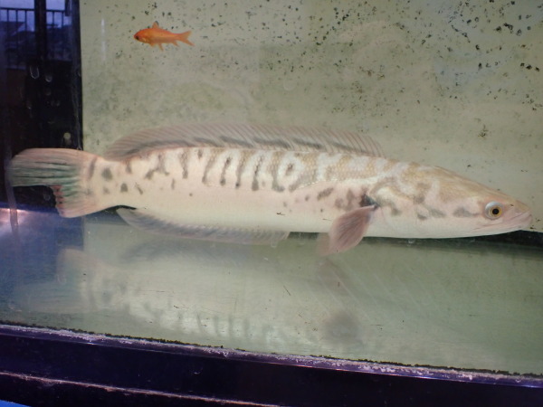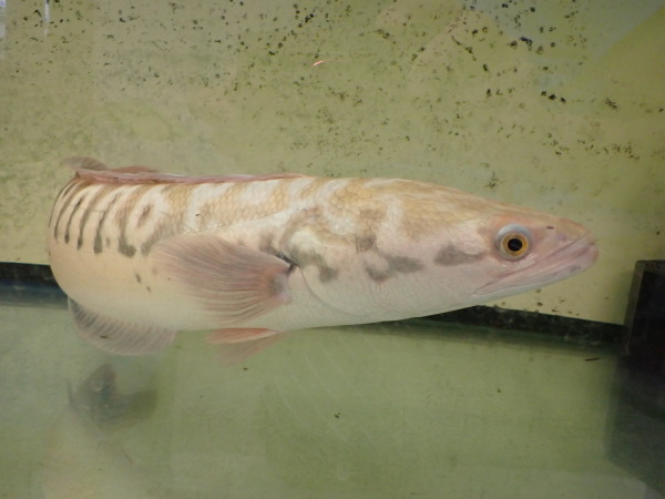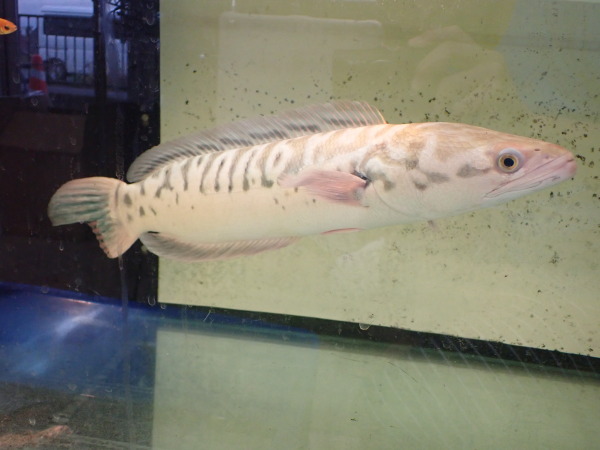 インドネシア産ワイルドのレッドスネークヘッドの色彩変異個体です。実は結構前に入荷したんですが、暴れて尾ビレの一部が折れて欠損してしまいました・・・。再生を確認してから販売しようと思ってストックしていましたが、欠損した部分が1cm程再生してきてキレイに戻りそうなのでそろそろ販売することにしました。完全に再生する前でしたら少し値引きしますので気になる方はお早めにお問い合わせください。白水槽でストックするとプラチナとはちょっと違いますがかなり白っぽい体色になり、普通の水槽でストックすると背中が水色で額や顔回りの一部に薄いオレンジが発色するなんとも不思議な表現になります。このタイプのレッドスネークヘッドは日本中探しても何匹もいないと思います!かなり希少な個体ですのでマニアの方はぜひ!!画像は全て同一個体です。上段、中段が白水槽ストックで下段が黒バックで砂利が敷いてある水槽でストックしてる状態の画像です。