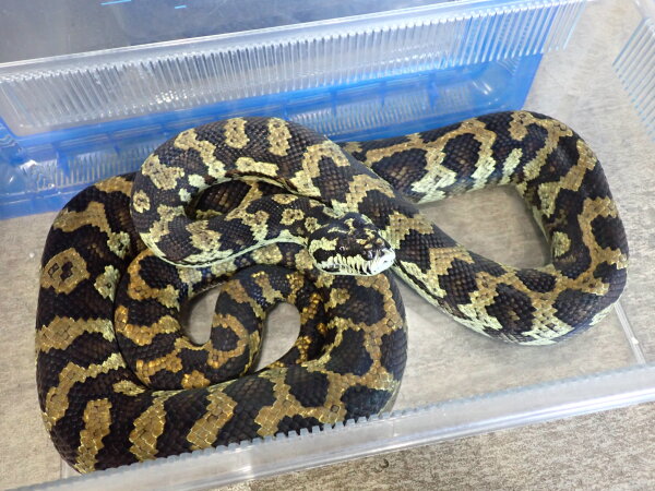 下取り個体につき超大特価!あまり黄色くはないので正直ジャングルカーペットとしてのクオリティは高くないですが、コモンカーペットのベビーだってもっと高かったりしますからね、ジャングルのメスのアダルトがこの値段なら相当お買い得です!しっかり測っていませんがサイズは1,5~2mの間位だと思います(ちなみに画像のプラケースの幅が42cmで奥行が24cm位です。)。性別はメスとのことですがこちらでは確認していませんのでお約束はできません、悪しからず・・・。サイズ大きくて存在感あります!ハンドリングも可能です(とはいえカーペットパイソンなんで油断はしないでください。)ので抱きヘビにもオススメですし、既にオスをお持ちの方は繁殖用の親にもいかがですか?激安につき早い者勝ち!!