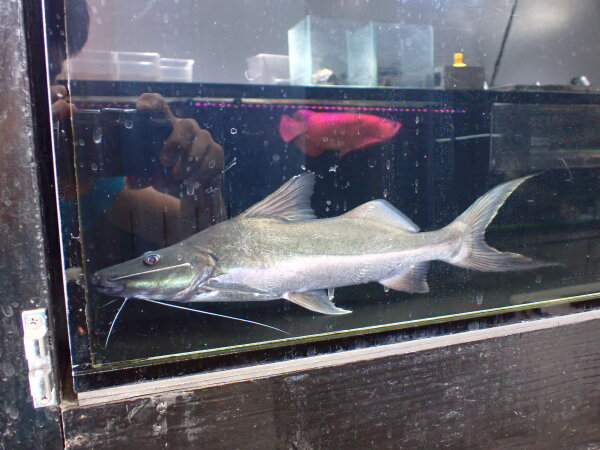 久しぶりの入荷です!常に1匹は在庫しておきたいと思う位大好きなナマズなんですが、最近なかなか手に入らなくて・・・。そんな中マラジョー産の大きめでナイスサイズな個体が入荷です!サイズの割に値段もかなりお買い得になってます!輸送のダメージで多少ヒレがバサバサしてたりヒゲが1本折れてたりはしますが問題無く完治する程度ですのでご安心を。この1匹が売れちゃったら次の入荷がいつになるかは分かりませんのでお探しだった方はお早めに!左上の画像です。いろいろ写り込んでて見にくい画像ですが、実物は体高あってかっこいい良個体です。