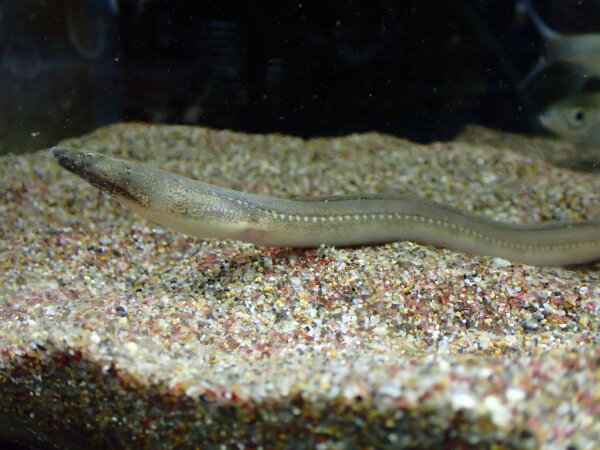 Lamnostoma mindora という学名のウミヘビの仲間。もともと採集例が極端に少なく、世界的にもとても珍しい魚です。台湾やフィリピン、インドネシアの一部などで分布が確認されておりましたが、数年前に沖縄でも確認され、沖縄がこの魚が発見された6か所目の場所で、分布の北限とされています。新種記載されたのはもう100年以上も前なのにほとんど見つかっていないというのは相当珍しい魚だということですね。ウミヘビの仲間の中では珍しく純淡水域での生息が確認されており、店頭でも純淡水でストックしております。独特な顔つきがかっこいいような気味悪いような、不思議な魚です。今後も安定して輸入されることはまずないと思いますのでウミヘビの仲間とか汽水魚の仲間とかがお好きな方は絶対に買っておいた方がいいと思います!こんなに珍しい魚の割には思ってたほど高くないので気になる方はお早めに!24日追記:3匹入荷しましたが残り1匹になりました。さらに追記:すみません、全部売り切れましたが問屋さんの在庫確認したらまだ少しいたので近日中に再入荷の予定です。上段の画像です。