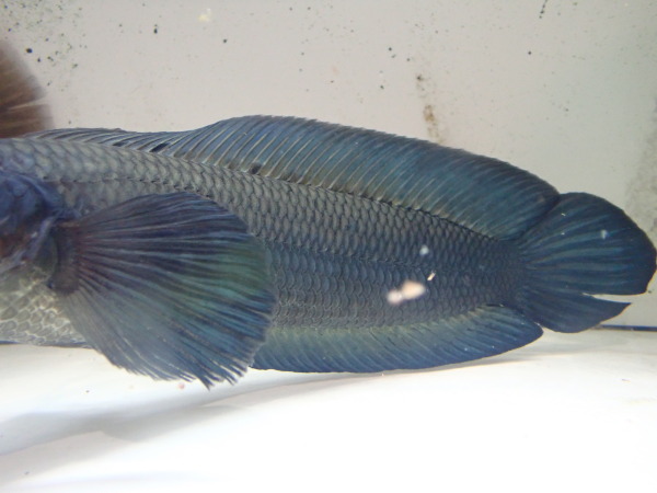 これ変わってます。模様は無くて全身がヒレまで紺色一色です。もう既に2~3か月店でストックしていますが今の所ずっと青いまま。最初は背面黒底面クリアのベアタンクでストックしいたんですが色は変わらずで、その後白い水槽に入れてみましたがやはり色は変わらず青いまま。このまま大きくなってくれたらかなりカッコいいですよね!?この青い体色が環境によるものなのか個体差なのかは分かりません。うちの店では青いままですが環境が変わったら色が戻っちゃったなんてことがあっても保証はできませんのでその辺はご了承ください。中段、下段の画像です。4つの画像は同一個体です。