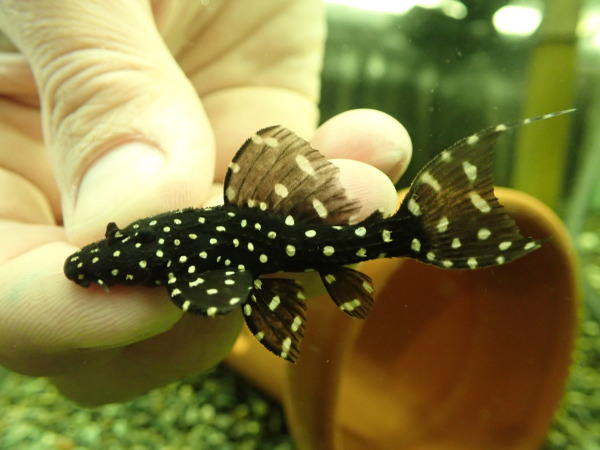 ペルー産のキンギャラ久しぶりの入荷です!まだ6cmですが鋭い棘が体側にならびカッコいいです!餌食いも良好でまだ来たばかりですが人工飼料バクバク手べてます!タパジョスのキンギャラとは体型も違うしコレクションして比べながら育ててみるのもいいと思いますよ!中段左の画像です。