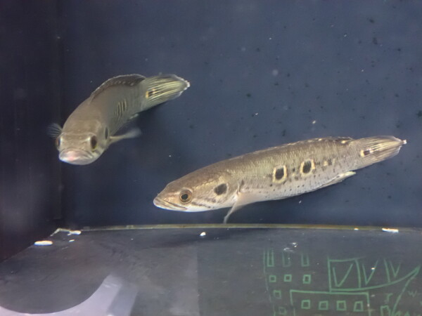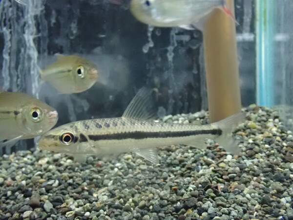 かなり久しぶりの入荷です。鼻先の丸いレポレルスみたいな顔で体側のラインと背中のスポットが特徴の珍しい種類。性格も大人しめで混泳もさせやすいです。入荷は1匹のみです!左下の画像です。