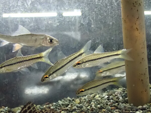 アフリカンサーベルシャークのインボイスで入荷しましたが、英名ではBlackstripe Barbって言うみたいです。Enteromius macropsという学名で最大17~18cmになるそうです。アジアのサーベルシャークみたいに体側に黒いラインが入り、レッドアイカラシンみたいに目がオレンジに光っててキレイです。これマックスサイズまで育てたら見ごたえある良い魚になりそうですね!中段左の画像です。