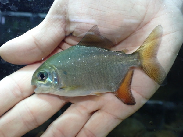 パロットドルフィンってけっこうあちこちにいるんですね。前はジャリから来ててこの前はアマパから来て、今回はシングー上流のアウデイアからです。今回のアウデイア産はちょっと変わってます。普通パロットドルフィンは臀ビレ黄色いですがアウデイア産は今回3匹入荷したんですが、そのうちの2匹は臀ビレ赤いです。もう1匹も赤くは無いですが普通のより全然ヒレの色が濃いです。あと顔つきもちょっと違う感じ。上顎が厚いというか鼻先がより大きい気がします。なんだか変わったパロットドルフィンで超オススメ!パクーマニア必見!!左下の画像です。