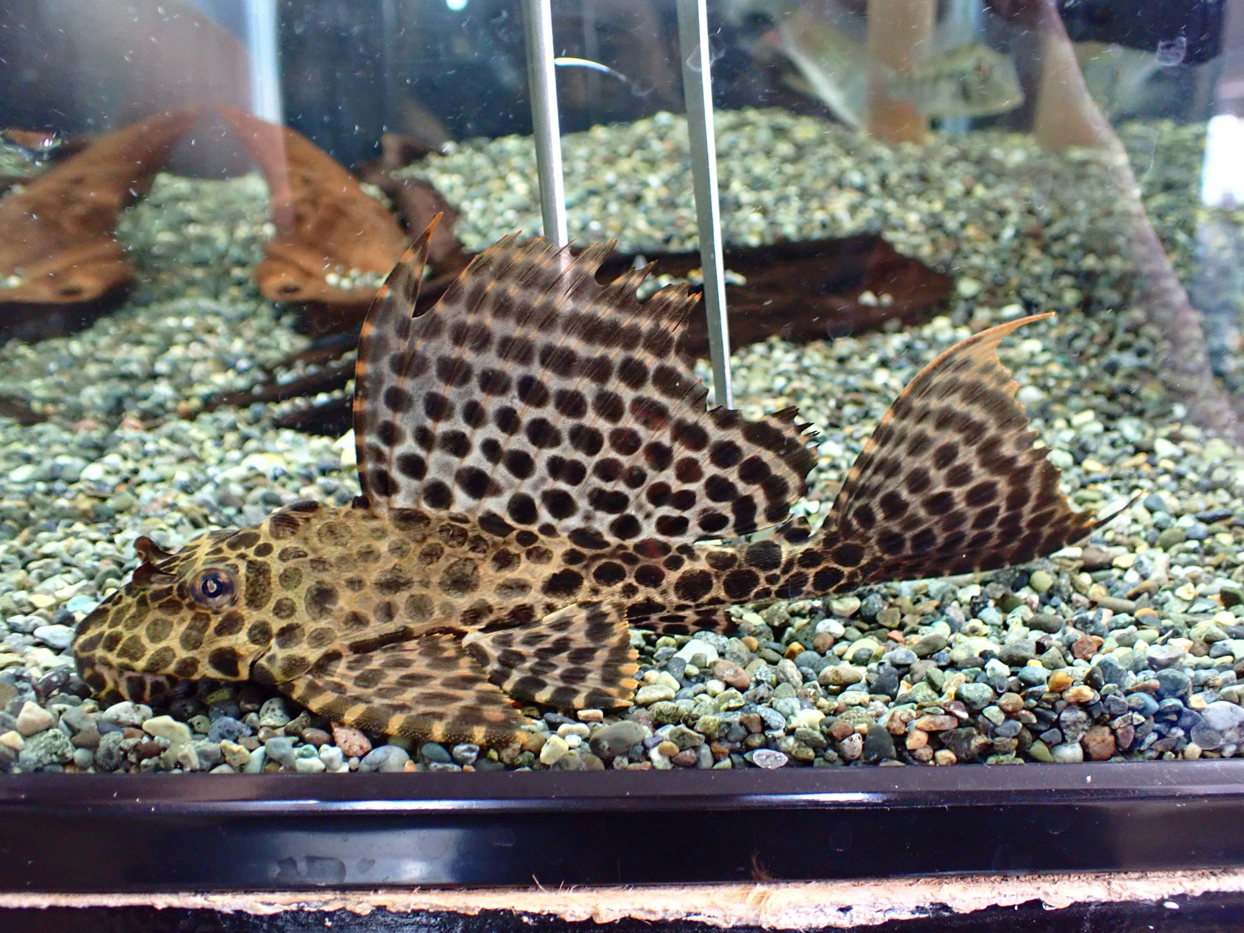赤茶色っぽい体色とキレイな丸いスポット模様からクイーンセルフィンに近い雰囲気の個体。背びれも大きくてとてもかっこいいです。コケ取にはもったいないけどもちろんコケもよく食べます。