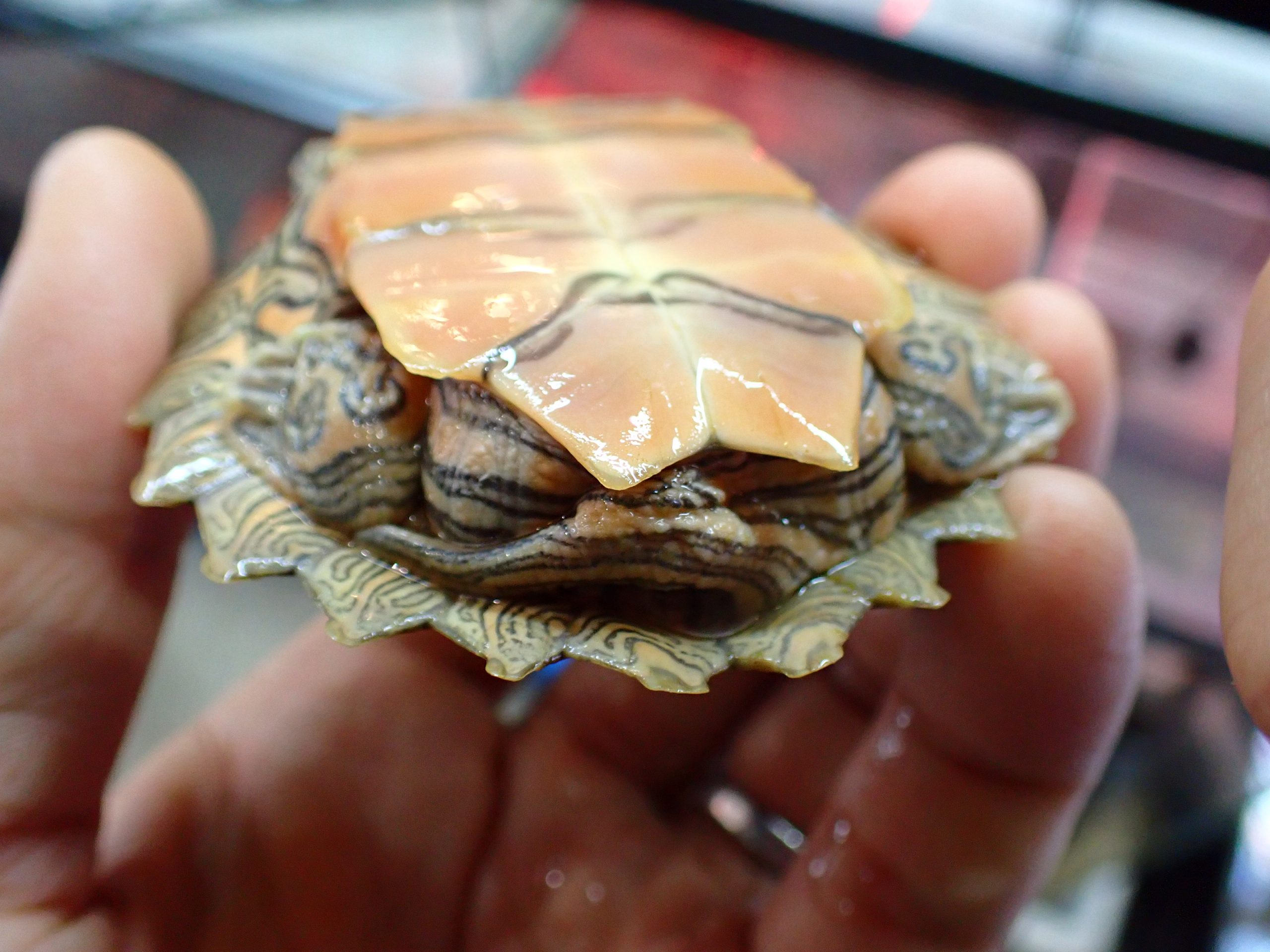 甲長8,5cmの安心サイズ。欠点の無いとてもキレイな個体で、餌も人工飼料バクバク食べてます。背甲の角みたいな突起とギザギザした縁甲板が怪獣みたいでかっこいいです!