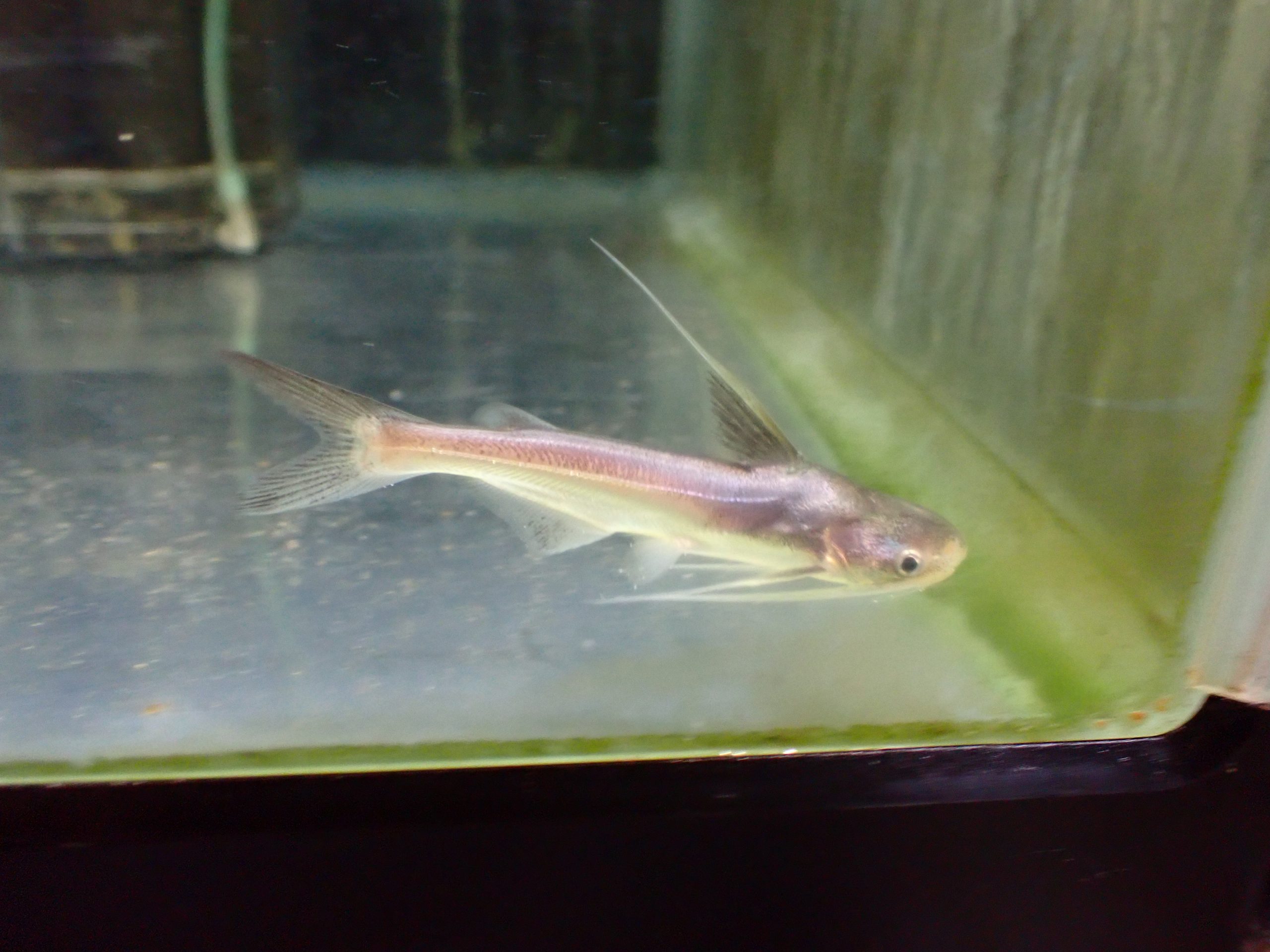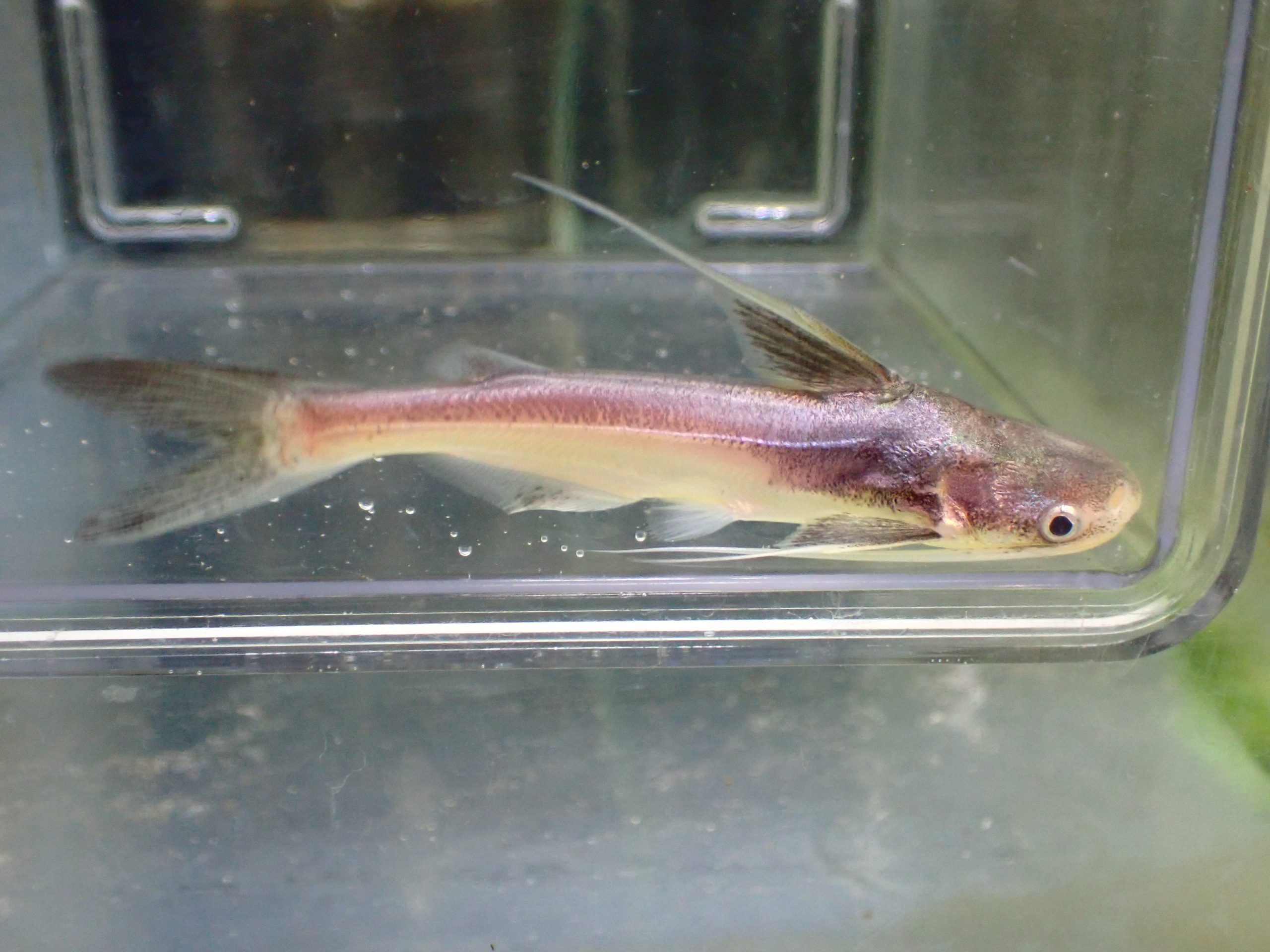 Bagre bagre です。トップフィンキャットの名前の通りアンテナのように長く伸びた背ビレが特徴の超激レアなハマギギ科の1種。ビカビカに光った金色の体色もキレイです。