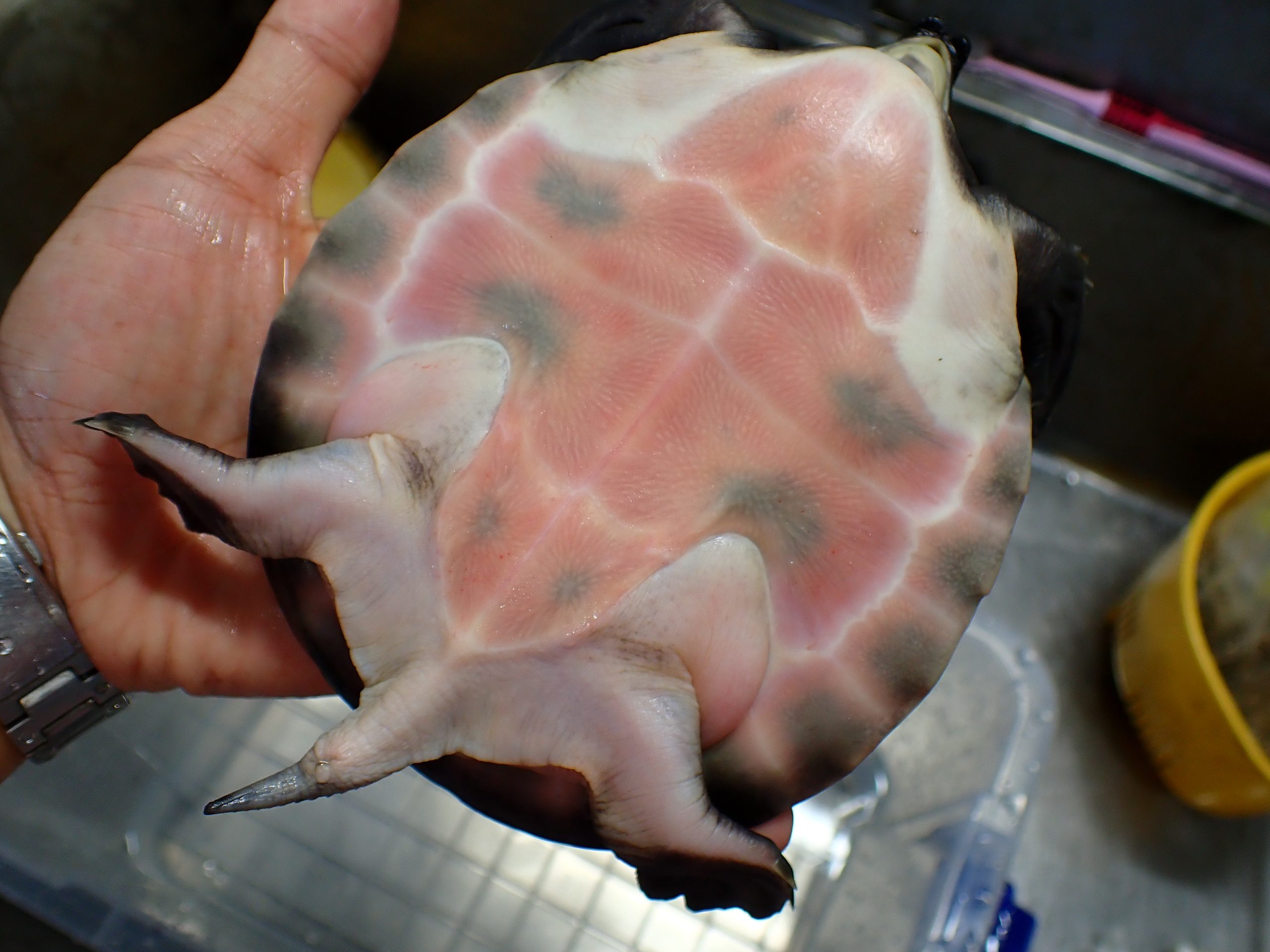 2025/4/14追記:写真更新しました。甲長12cmで入荷しましたが13cm程に成長しています。皮膚、腹甲はキレイで肌荒れなどはありません。爪欠け、水かきの欠損、尾切れもありません。甲羅の縁もキレイだと思います。甲羅の表面が少々荒れていてカサついてます。餌食いは良好ですのでキレイな水で飼えばしばらくで治ると思います。