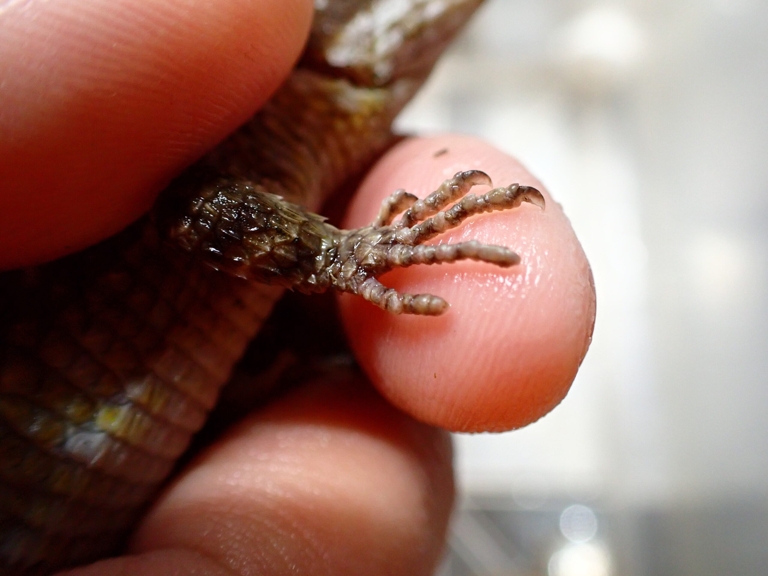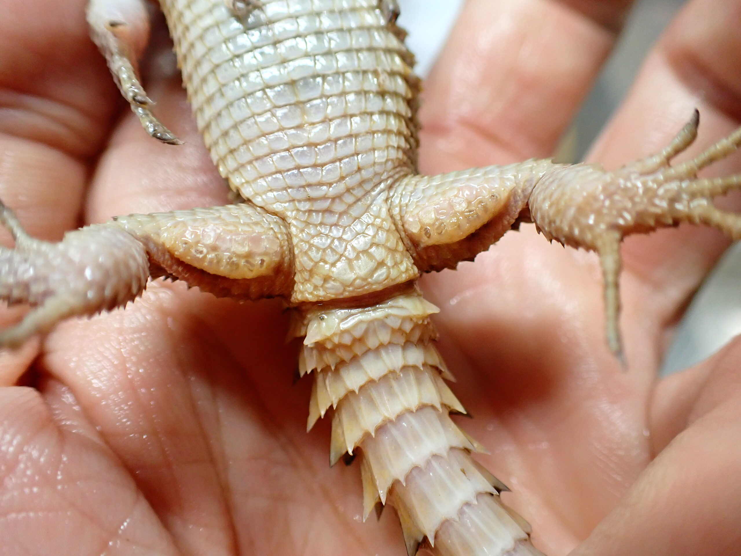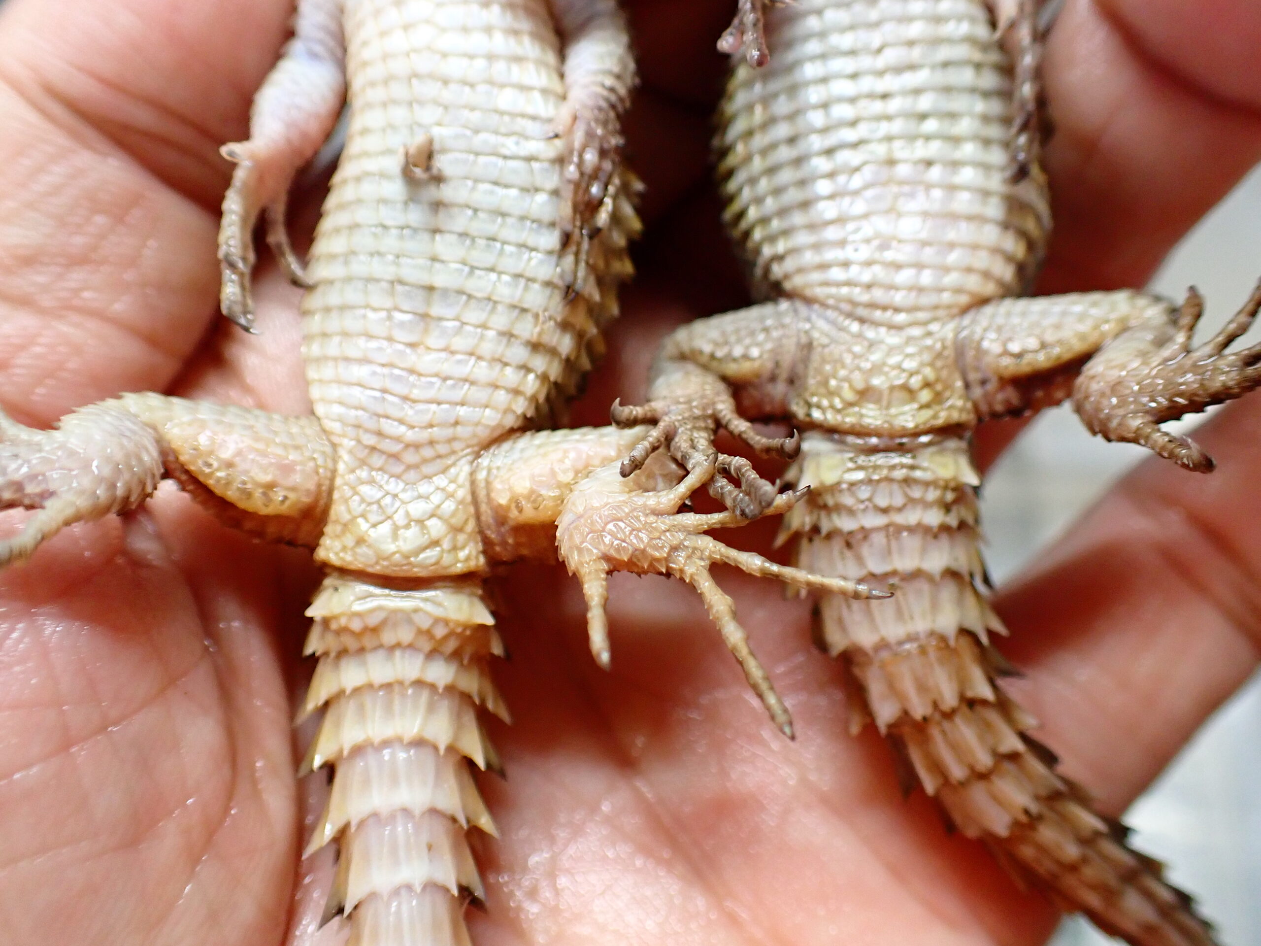 オスは欠損などありません。メスは左前脚の外側2本の指で爪欠けありますがそれ以外に尾切れ爪欠けはありません。雌雄の判別は総排泄腔下の外側に張り出した棘状の鱗の大きさ、大腿孔の発達具合で判別していますが絶対ではありません。雌雄の保証はできませんので予めご了承ください。