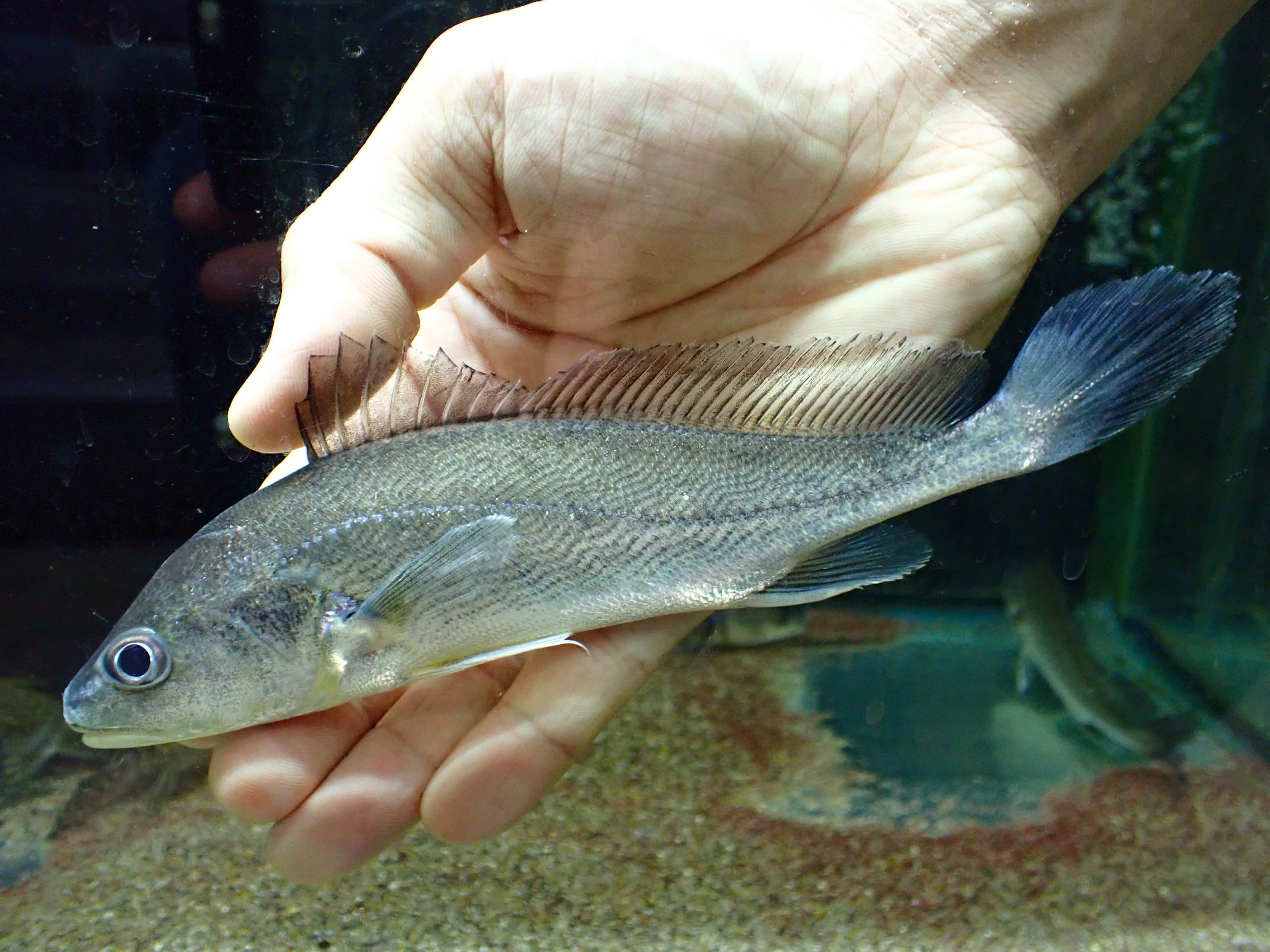 純淡水で大丈夫です。痩せてくることが多い魚ですが今回は痩せもなく着状態は良好です。生き餌を好みますが川エビやキビナゴなど冷凍餌には簡単に餌付きますし、人工飼料に餌付く個体も意外と多いですよ!大きくなるとすごくかっこいいですよ!