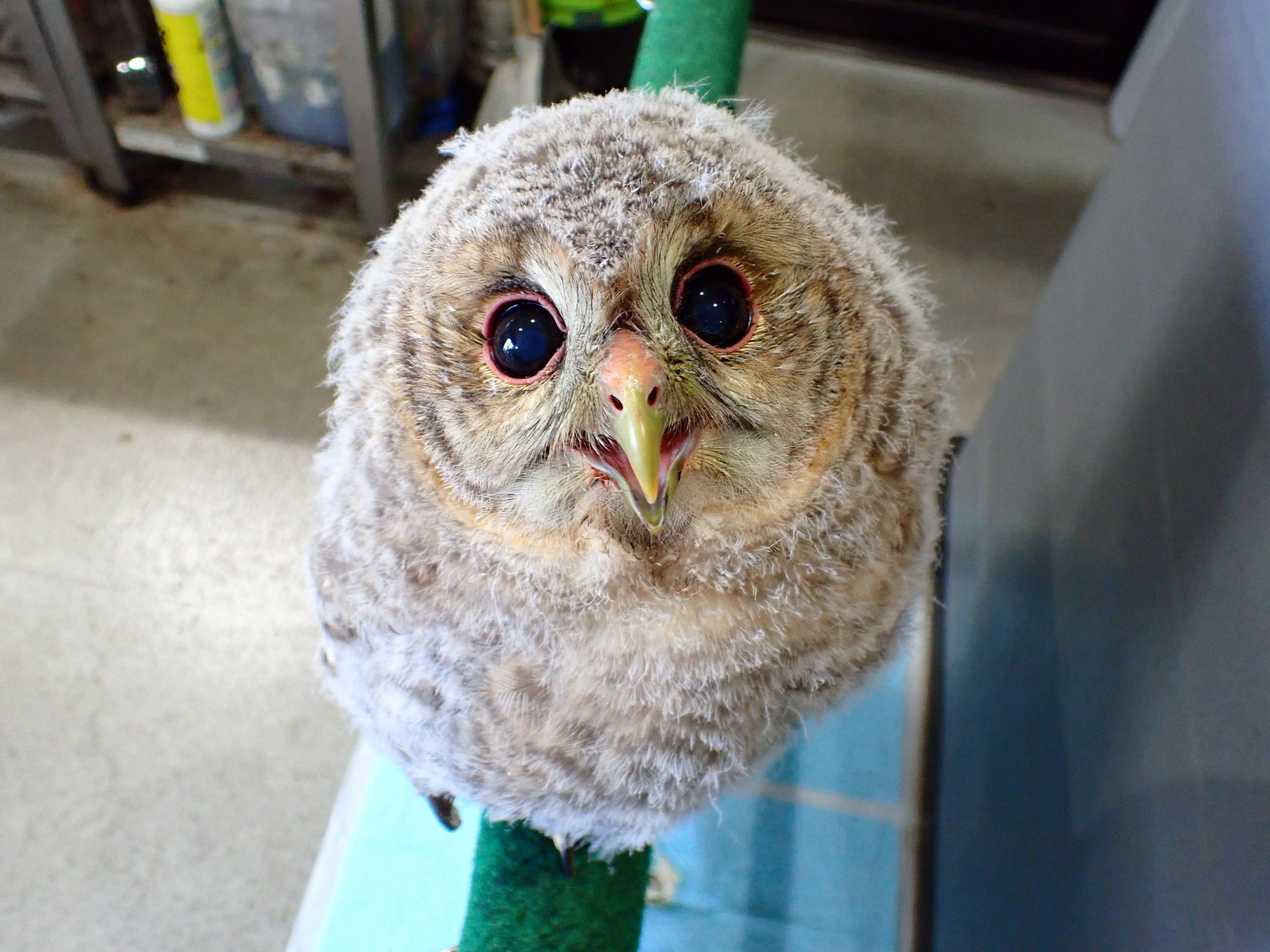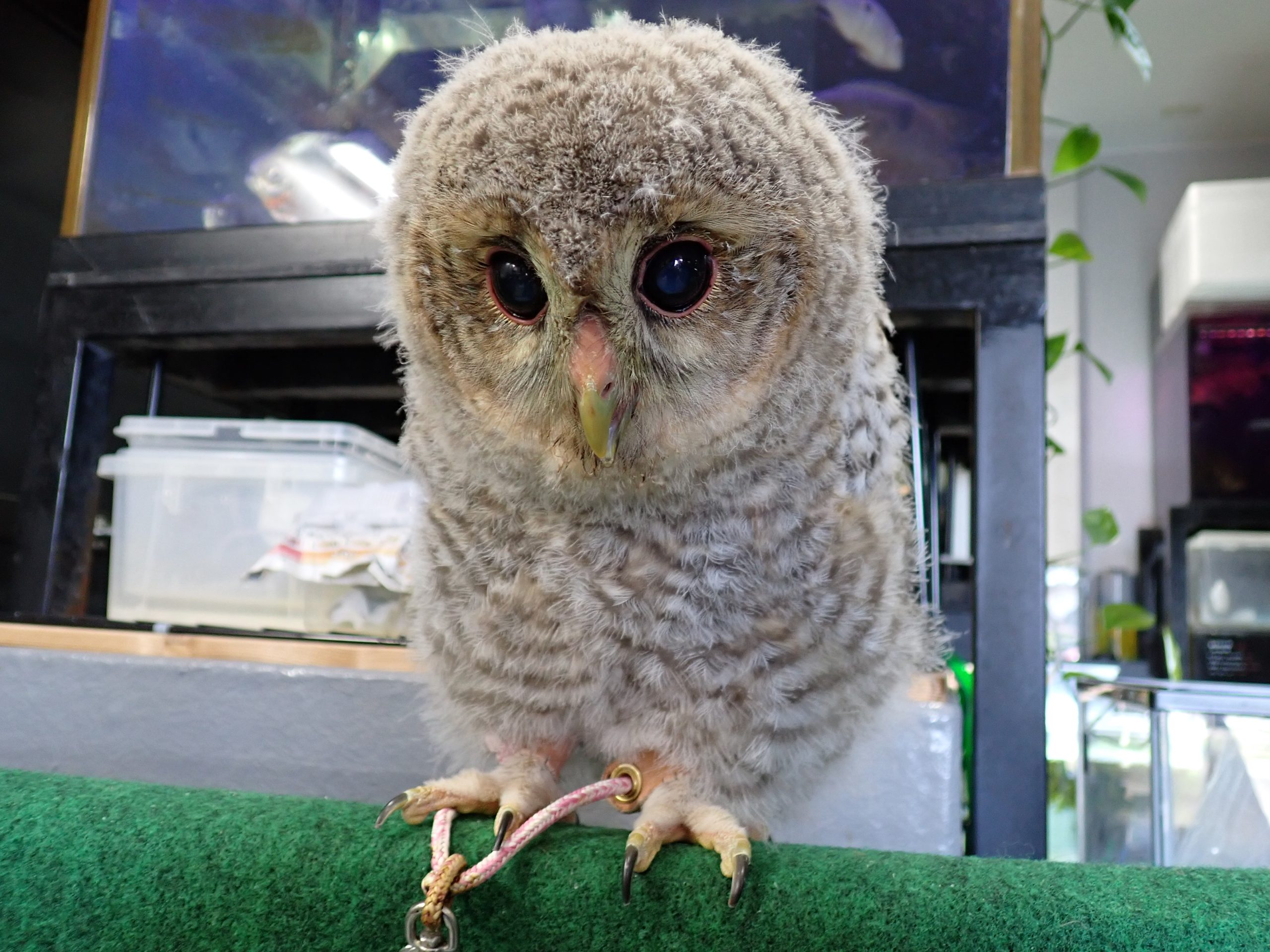 2025年3月30日生まれのまだ綿毛の残る雛です。一緒に入荷したたぶんオスの個体と兄妹です。この子もとても良く馴れていてかわいいですよ。モリフクロウは雌雄で大きさに違いが出てメスの方が大きいのですが、後に生まれたこの個体の方が一回り大きいです。大きめがいい方はメスがオススメです。