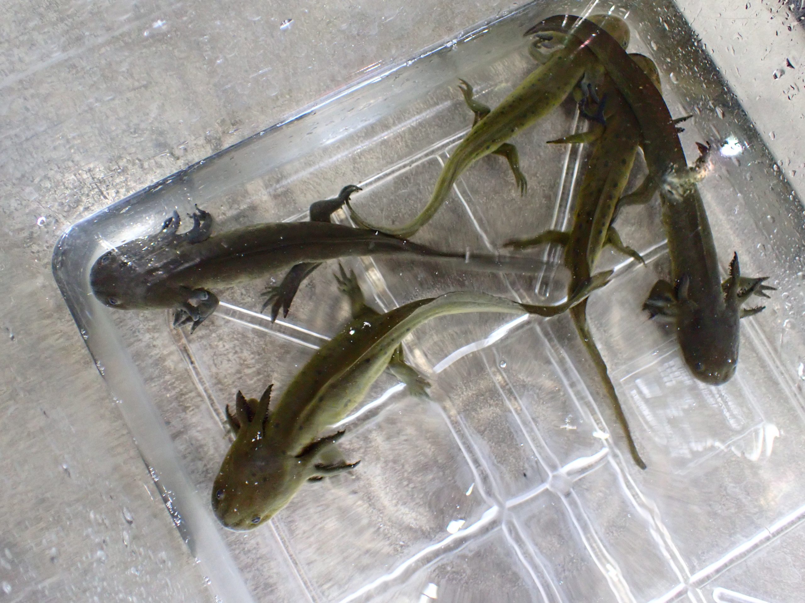 超久しぶりのウォータードッグです。昔は沢山輸入されてたんですけどね、何故か最近は全然来なくなっちゃいました。真偽のほどは不明ですが、幼体のうちにどれだけデカくできるかで上陸してからのサイズが変わるなとか、水温を下げて幼生の期間をできるだけ長くして育てた方がデカくなるとか、なんかそんな話を聞いたことがありますが実際のところどうなんでしょうか??上陸済みの個体を買うより安いし、変態する様を観察しながら育てるのも楽しいですし、ウォータードッグからの飼育は面白いからオススメです。今はウーパールーパーと同じ感じで飼って、外鰓が小さくなって上陸しそうな気配が出てきたら水位を下げてコルクや流木などで陸場を作ってあげれば上陸します。多少ヒレ欠けのある個体もいますが、上陸する時に吸収されて無くなっちゃう部分なんでご了承ください。