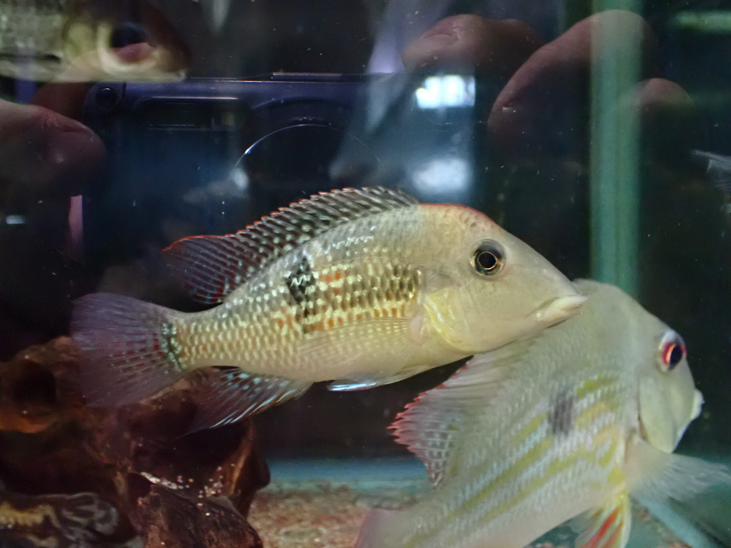 ブリードの小さいのはたまに輸入されてますが大きめでしかもオスメス揃っての入荷はとても珍しいです。2匹セットでの販売になりますが、繁殖行動をとっているペアと言うわけではありません。ですが他の魚との混泳水槽で一緒に入れてありますが全くトラブルはありませんし、2匹でお互い離れずに仲良く泳いでいることも多いです。ゴールドダストアースイーターと呼ばれるゲオなだけあってオスの成魚は金色のラメ状の発色がとてもキレイです!1枚目がオスで2見目がメスの画像です。