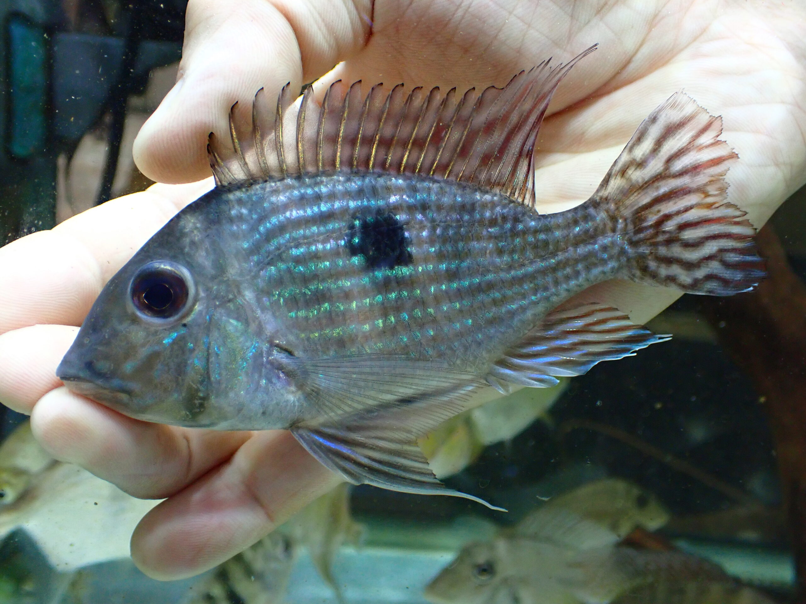 ずんぐりした体型と体側や尾ビレに入る細いラインが特徴のゲオファーガスです。ブリード個体が出回ることもありますがワイルドの入荷は稀です。キレイでオススメのゲオファーガすです!1匹のみです。