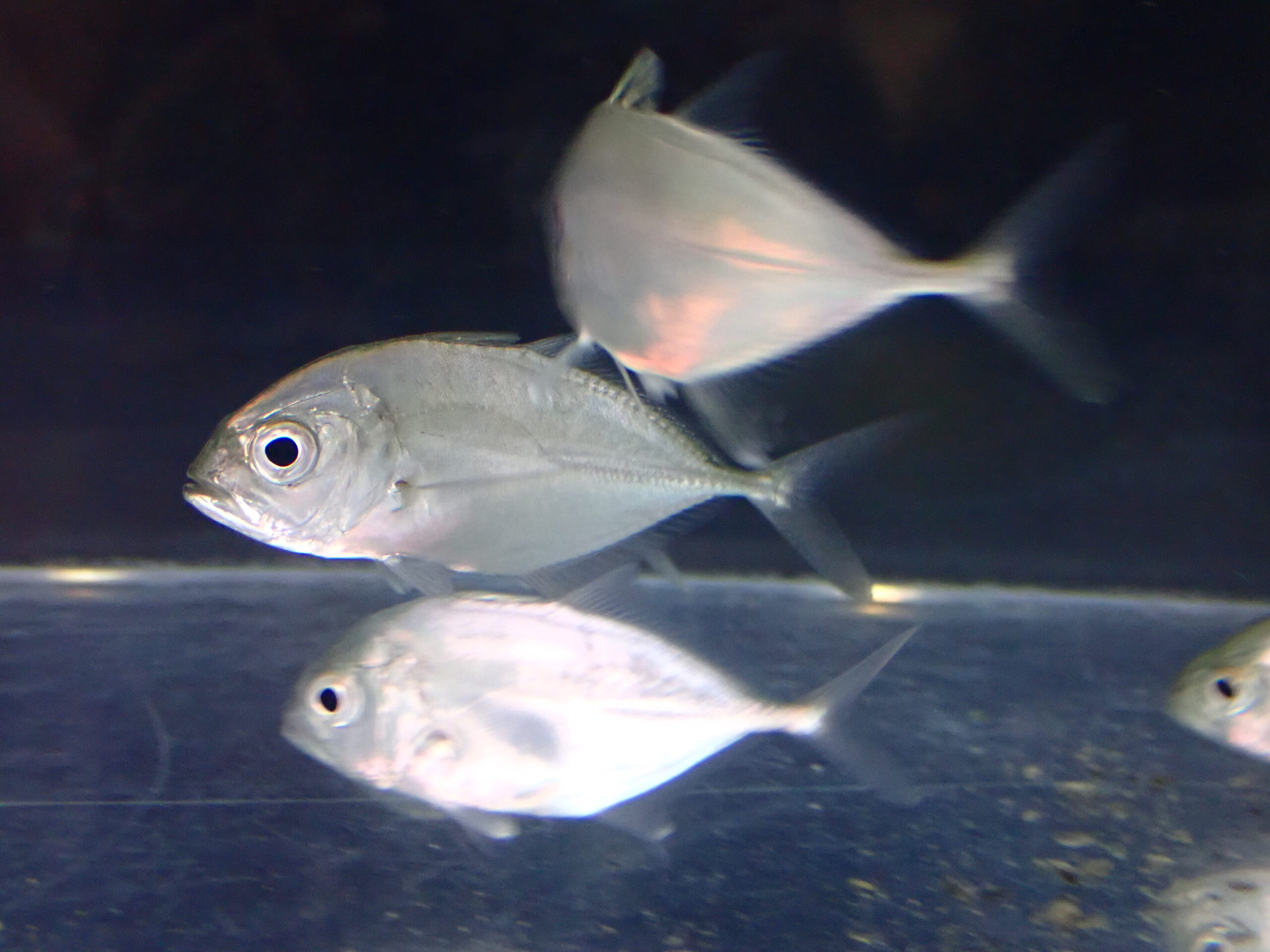 淡水アジと表記していますが実際には汽水です。現状は0,2%の塩分濃度でストックしています。ただ小さいうちは慣らせば本当に淡水でも飼えます。でも淡水OKなのは小さいうちだけで、最終的には塩分が必要になります。今回何種類か混じってきてますが、たぶんギンガメアジとロウニンアジかな?クリアのベアタンクでストックして色飛んでるのではっきり分かりませんが・・・。