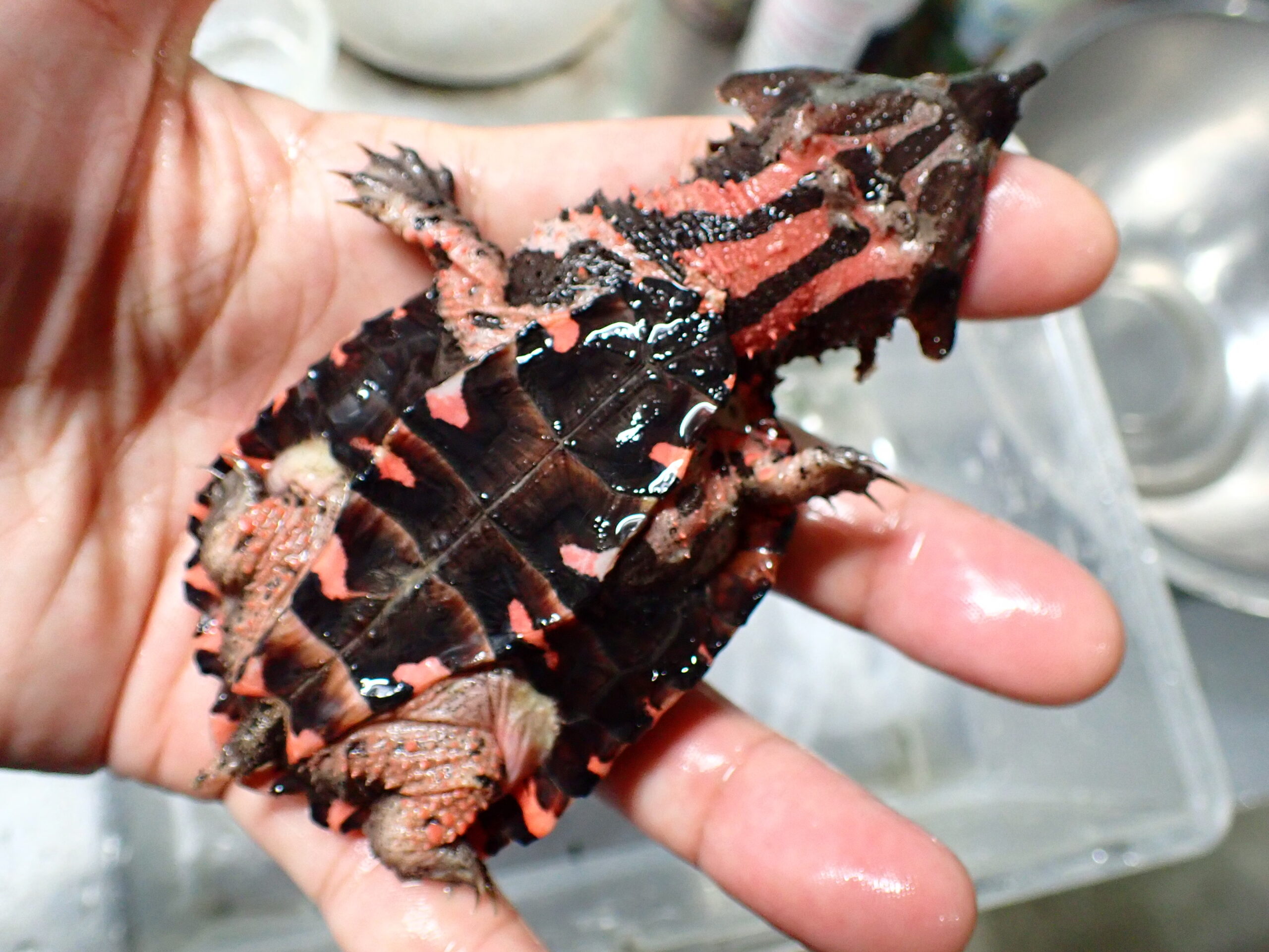 オリノコよりも甲羅に厚みがありよりゴツゴツした感じが特徴のアマゾンマタマタです。冷凍餌に餌付いています。ピンセットから冷凍モツゴや冷凍ドジョウ食べますので生き餌を用意する必要ないので飼いやすいですよ!