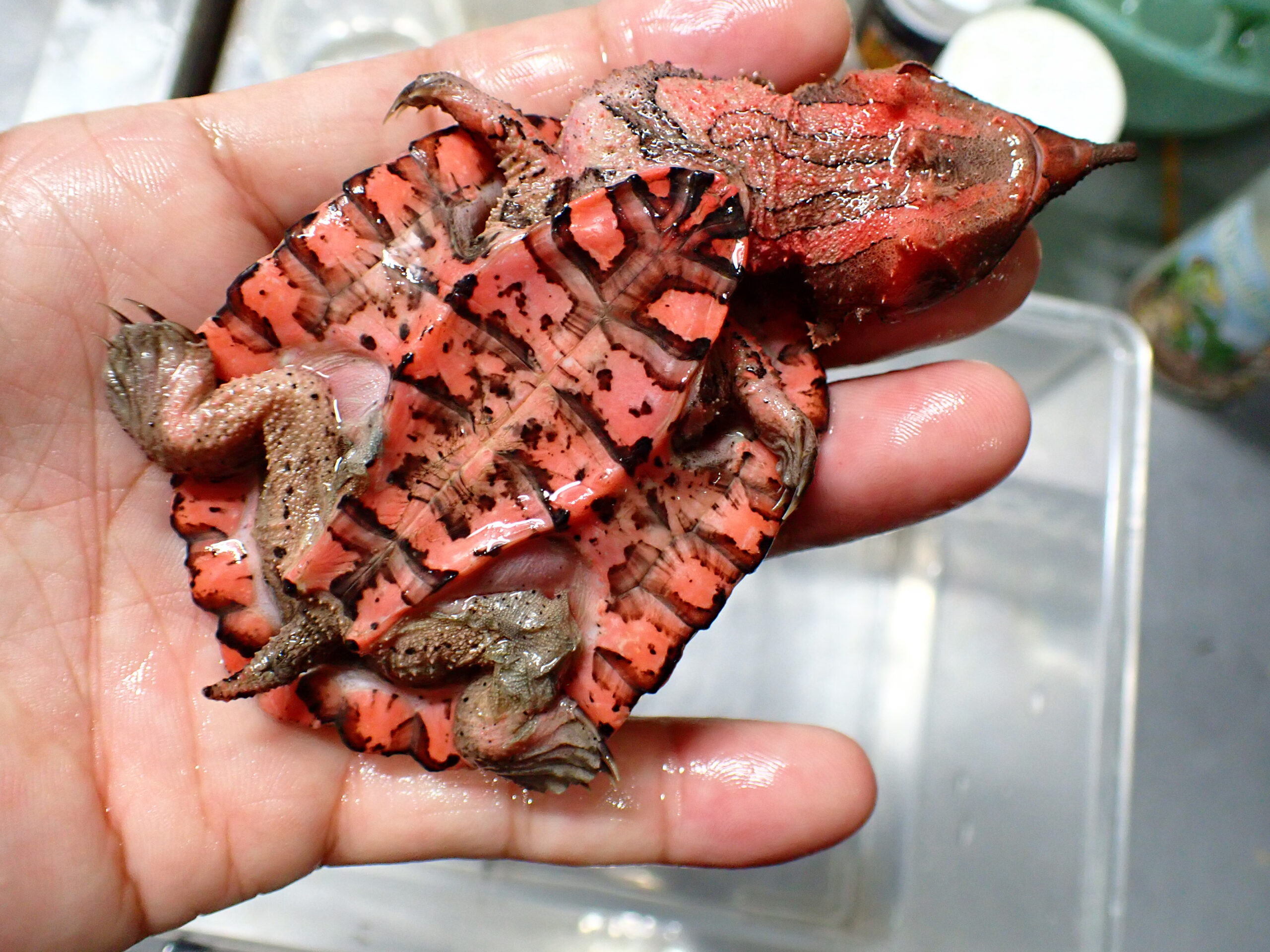 アマゾンよりも鮮やかなオレンジやピンクの発色が特徴のオリノコマタマタです。冷凍餌に餌付いています。ピンセットから冷凍モツゴや冷凍ドジョウ食べますので生き餌を用意する必要ないので飼いやすいですよ!