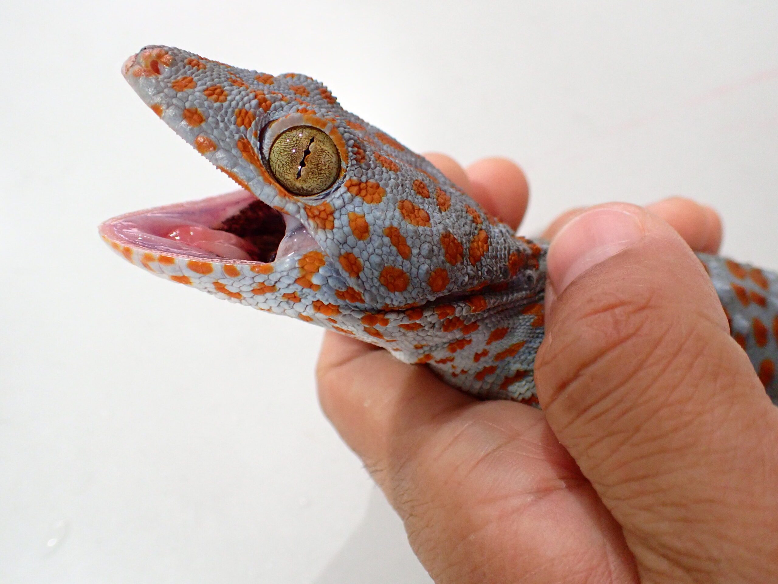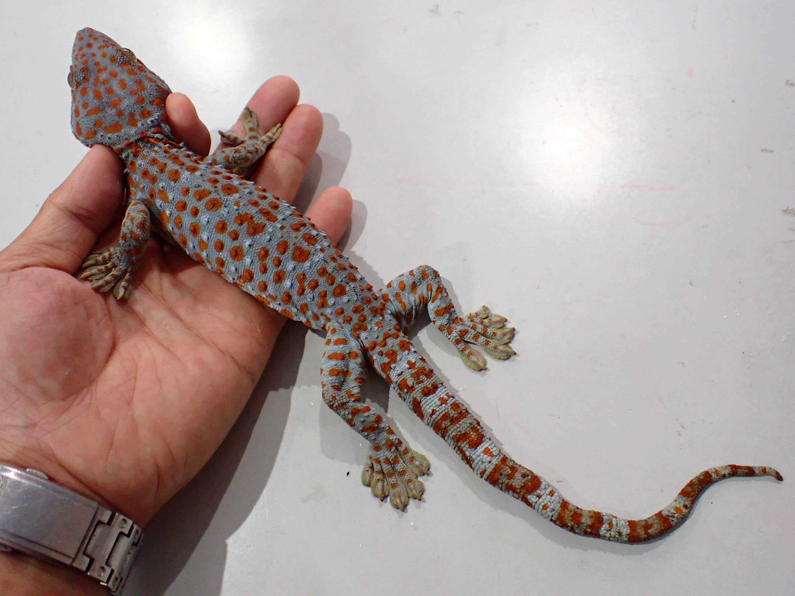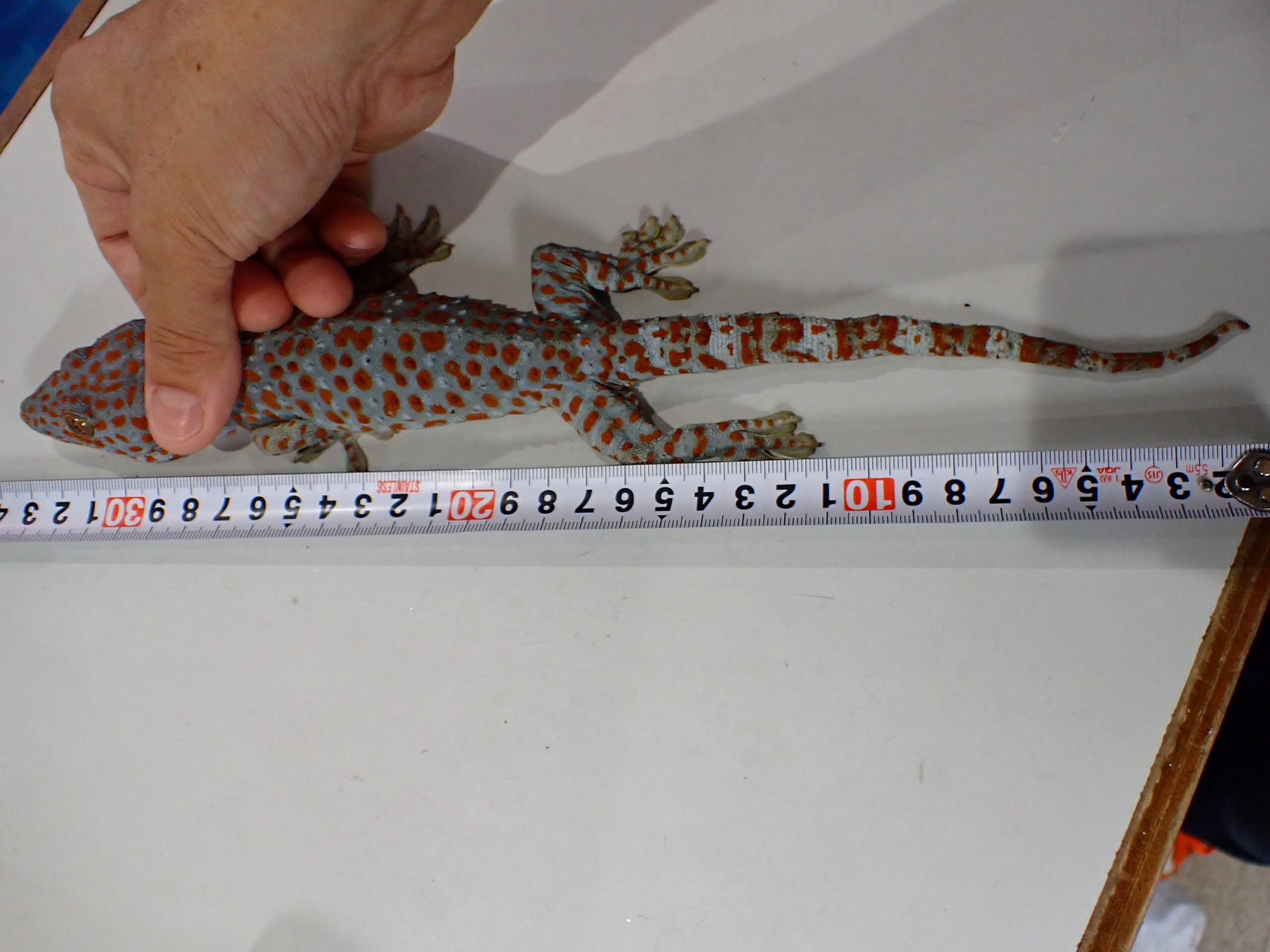 デカくなるのはタイ産だけではないですね。インドネシア産でも30アップです!デカいトッケイかっこいいです!このサイズで輸入された個体ですが、輸入されてから2か月程問屋さんでストックされていた個体なので状態は良好です。尾に少々のよれはありますが完全尾な個体です。